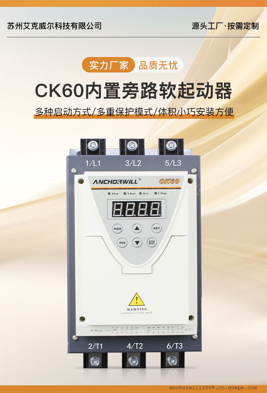 Eckwell CK60 soft starter adopts intelligent digital control, with single chip microcomputer as intelligent center, thyristor module as executive component, to control motor fully automatically, it is suitable for all kinds of loads and squirrel cage asynchronous motor starting. The motor can start smoothly under any working condition, protect the driving system, reduce the impact of starting current on the power grid, and ensure the reliable starting of the motor. Slow down and stop horizontally, eliminating anti-inertia impact of drag system. Complete system protection function, extend the service life of the system, reduce the system maintenance cost, improve the reliability of the system.